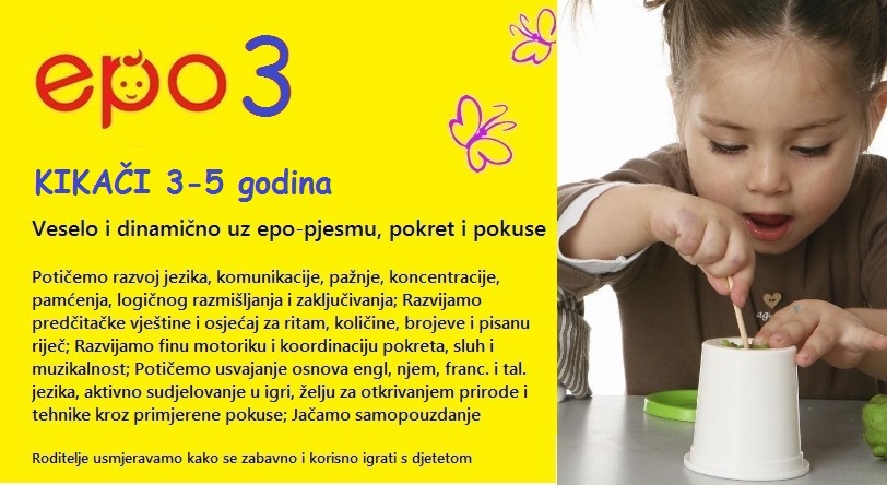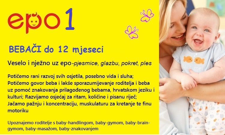 Epo-igra JE PROGRAM RANOG BAVLJENJA S BEBAMA I MALOM DJECOM oOD ROĐENJA DO 6 godina. Kroz igru djecu vodimo kroz program s ciljem da ona razvijaju jezik, govor i komunikaciju, pažnju, pamćenje i koncentraciju, osjećaj za ritam i glazbu, sluh i muzikalnost, koordinaciju pokreta, svoj vid i druga osjetila. Kao spužvice bebe i mala djeca upijaju jezike, pisanu riječ, količine i brojeve, razvijaju ljubav prirodi i tehnici, a usput se svi skupa prekrasno zabavljamo u malim grupama do 8 polaznika.